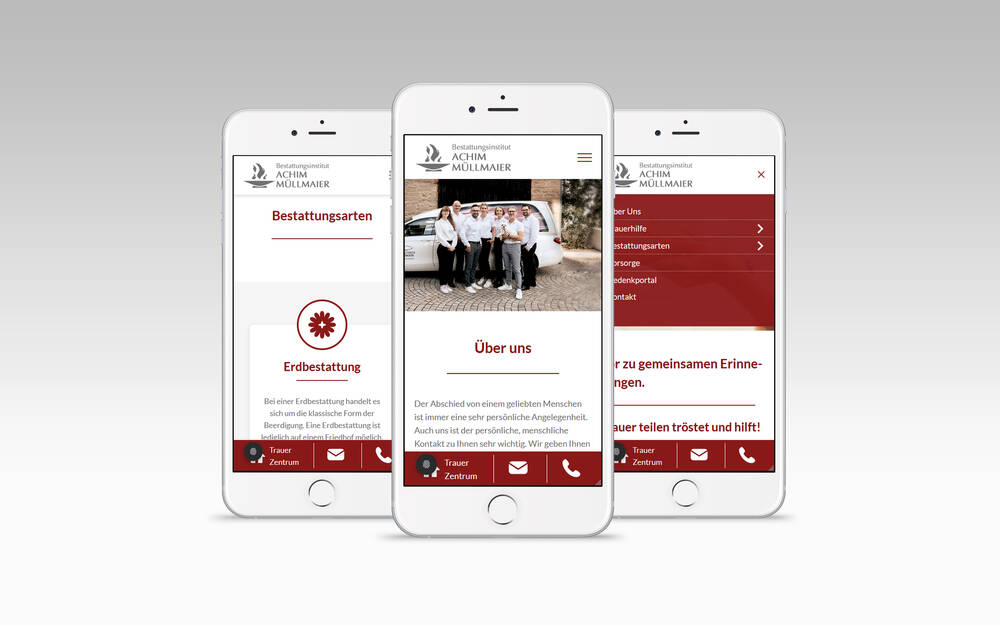 Die mobile Website wurde vollständig neu konzipiert und konsequent auf Touch-Bedienung ausgelegt. Zentrale Funktionen wie Trauerzentrum, telefonischer Kontakt und E-Mail-Anfrage sind jederzeit direkt erreichbar. Inhalte werden in klar gegliederten Content-Blöcken dargestellt. Bildskalierung, Schriftgrößen und Abstände passen sich dynamisch an unterschiedliche Displaygrößen an. Das responsive Design gewährleistet eine stabile und intuitive Nutzung auf allen Endgeräten.