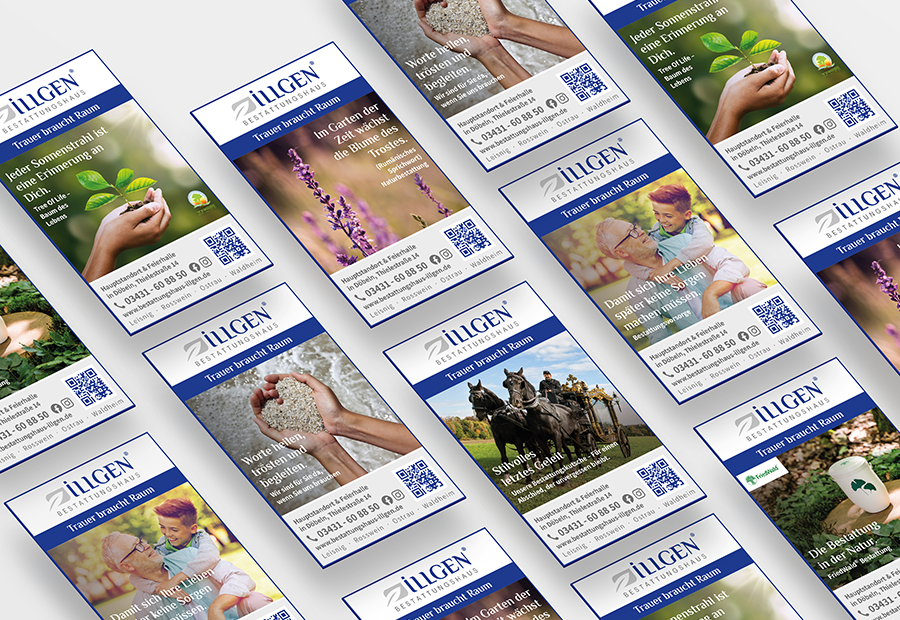Für das Bestattungshaus Illgen in Döbeln haben wir im aktuellen Corporate Design eine Anzeigenserie zu 22 verschiedenen Schwerpunkten erstellt. Hierbei waren uns eindrucksvolle Motive, gute Lesbarkeit und eine emotionale Bildsprache wichtig.