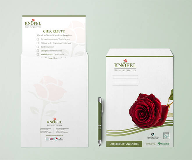 Die neuen Briefumschläge für den Bestattungsservice Knöfel ziehen direkt die Aufmerksamkeit auf sich und heben sich durch das großzügige DIN C4 Format vom Standard deutlich ab. Die individuellen Umschläge kommen ohne Sichtfenster und sind beidseitig bedruckt.