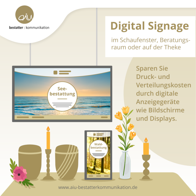 Bieten Sie den Hinterbliebenen und Interessierten eine moderne und würdevolle Informationsvermittlung mit Digital Signage. Rufen Sie uns an und lassen Sie sich beraten: 0341 - 242 52 85