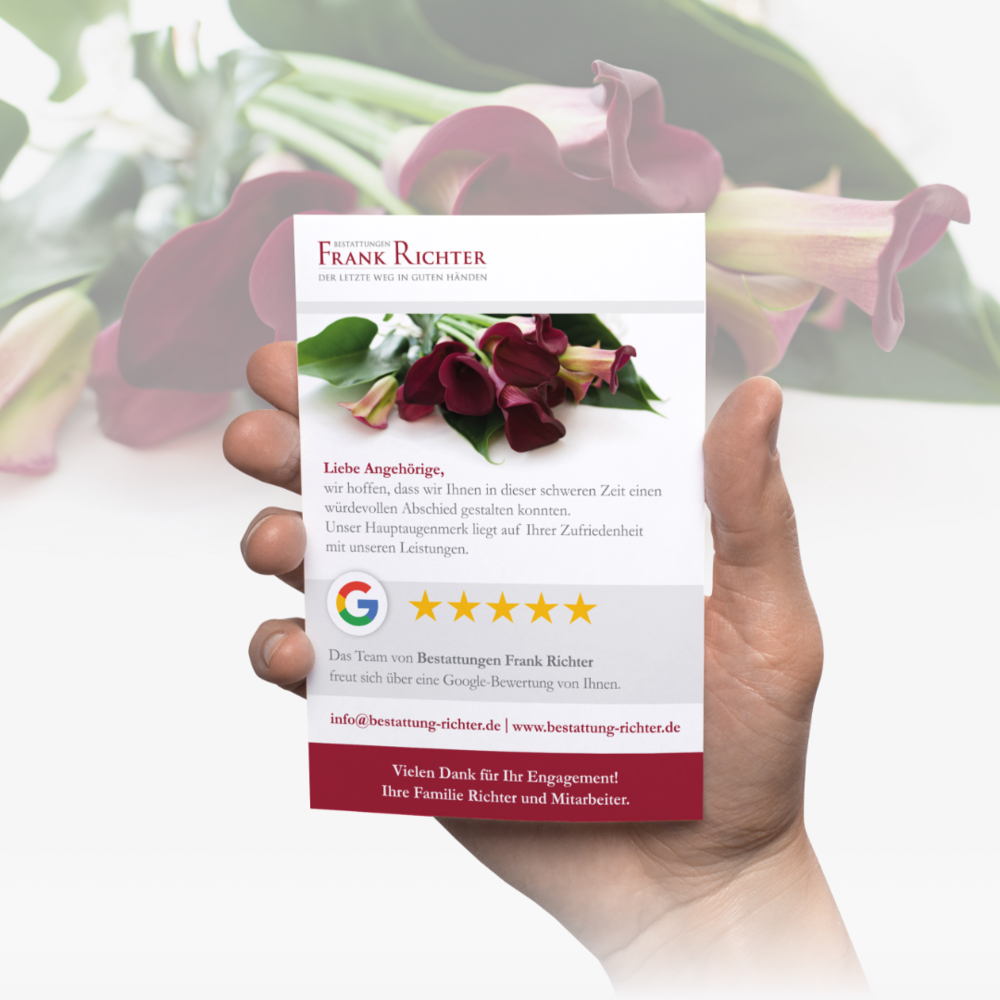 Im Bereich Empfehlungsmarketing sind digitale Bewertungen auf Google und Co. längst nicht mehr wegzudenken. Diese sind so zusagen das Aushängeschild eines Unternehmens und weisen – wenn möglichst viele Sterne vergeben werden – auf eine besonders hohe Qualität der entsprechenden Dienstleistungen hin. Für Bestattungen Frank Richter haben wir daher Google Bewertungskarten im DIN A6 Format gestaltet, damit das Bestattungshaus die Hinterbliebenen darauf aufmerksam machen kann, eine Google Bewertung abzugeben. Wir danken für die freundliche Zusammenarbeit.