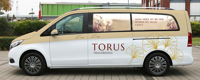 In Zusammenarbeit mit Kuhlmann-Cars GmbH haben wir die Gestaltung für den neuen Bestattungswagen für das Torus Trauerhaus "Bestattung und Trauerbegleitung" aus Rochlitz übernommen. Dabei wird das Corporate Design und die Philosophie des Unternehmens optisch auf dem Mercedes V-Klasse Fahrzeug gekonnt in Szene gesetzt.