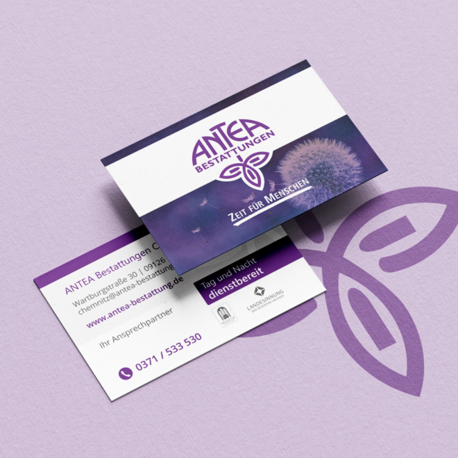 Die Visitenkarten von ANTEA Bestattungen Chemnitz GmbH haben nun ein auffrischendes Re-Design erhalten.