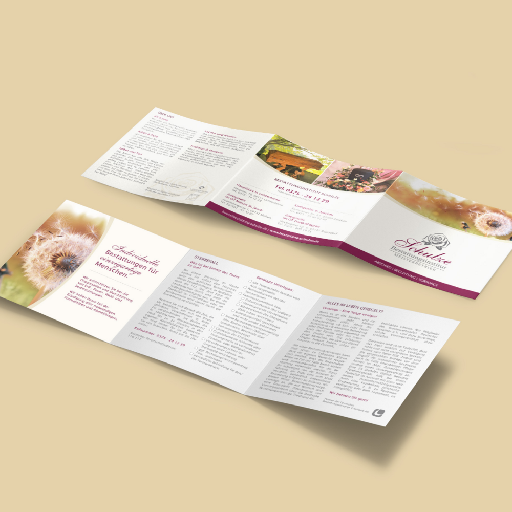 Für das Bestattungsinstitut Schulze haben wir den derzeitigen Imageflyer umgestaltet. Der Flyer strahlt nun mit neuen Fotos und wärmeren Farben.