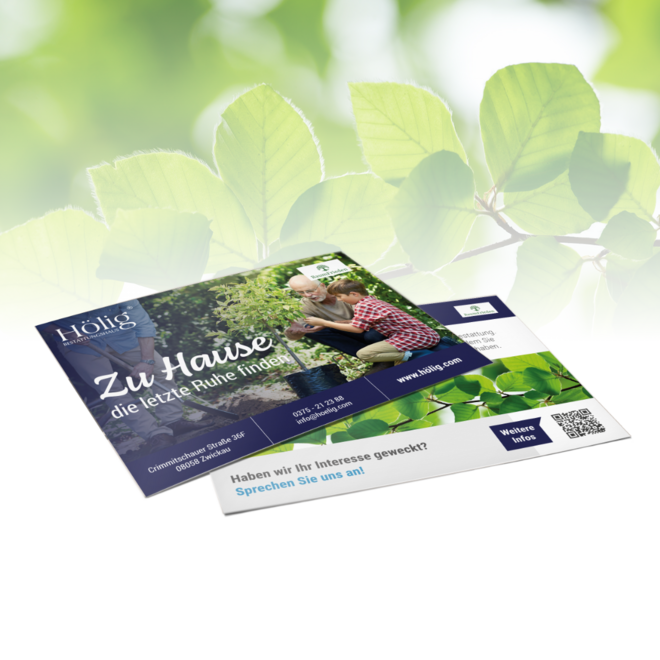 Für das Bestattungshaus Hölig haben wir so genannte Tip-on-Cards gestaltet. Die Tip-on Card ist eine Werbepostkarte, welche mit der Zeitung verteilt wird. Anstatt allerdings nur lose und in vom Verlag vorgegeben unhandlichen Formaten irgendwo dazwischen zu liegen, ist diese mit einem Klebepunkt, z.B. direkt auf der Frontseite fixiert und erreicht somit viele Menschen.