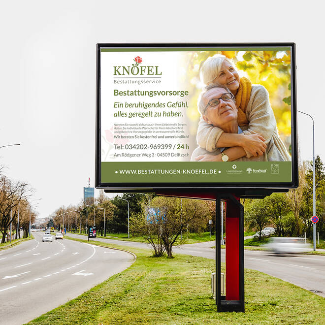 Für den Bestattungsservice Knöfel durften wir ein großes Werbeplakat zum Thema Bestattungsvorsorge gestalten. Dieses bietet eine hohe Sichtbarkeit und die Möglichkeit Botschaften ansprechend darzustellen. Dadurch wird die Unternehmensbekanntheit gesteigert und man erreicht einen hohen Wiedererkennungswert.